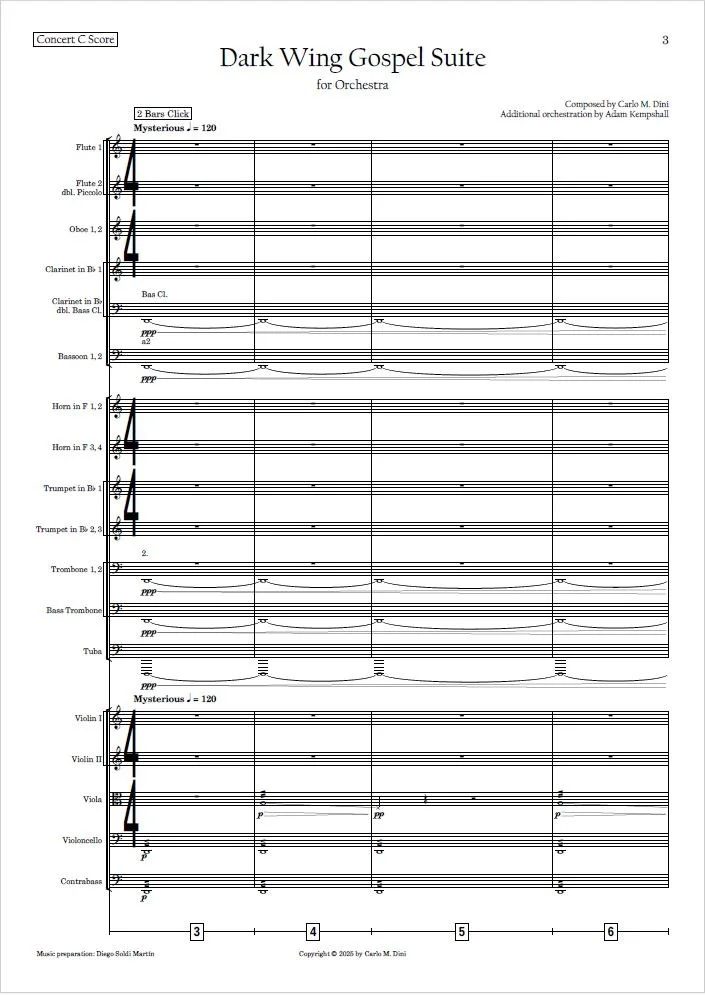 Score for a short orchestra suite (abt. 5 minutes) of my 2024 work, Dark Wing Gospel.